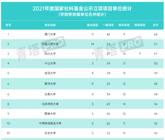 另外,今年8月19日,教育部社科司公布了2021年度教育部人文社会科学研究一般项目评审结果,厦大共35项项目获得立项,同样位列全国高校第一。其中,规划基金14项,青年基金21项。