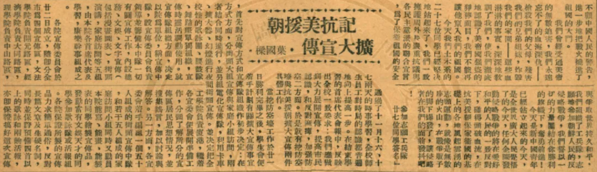 除积极响应号召赶赴前线,厦大师生还积极向社会宣传动员抗美援朝工作。志愿军入朝作战伊始,厦大学生就自发组织起多个宣传大队,以歌咏、音乐、话报演出等形式,走上街头,向社会痛斥美帝国主义的暴行,讲述赴朝作战的重要性。
