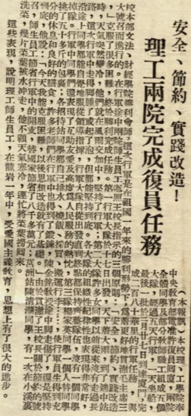 为了保证教学实验的正常开展,厦大理学院和工学院奉命疏散到龙岩。1951年3月,理、工两学院师生执杖肩包、抖擞徒步向龙岩迁移,4月1日便完成工作,正式上课。1952年2月,由于海防巩固,两个学院开始护送仪器设备回迁。回迁过程中,师生组成5个大队,经过五天的步行行军,一天坐船,回到了学校。