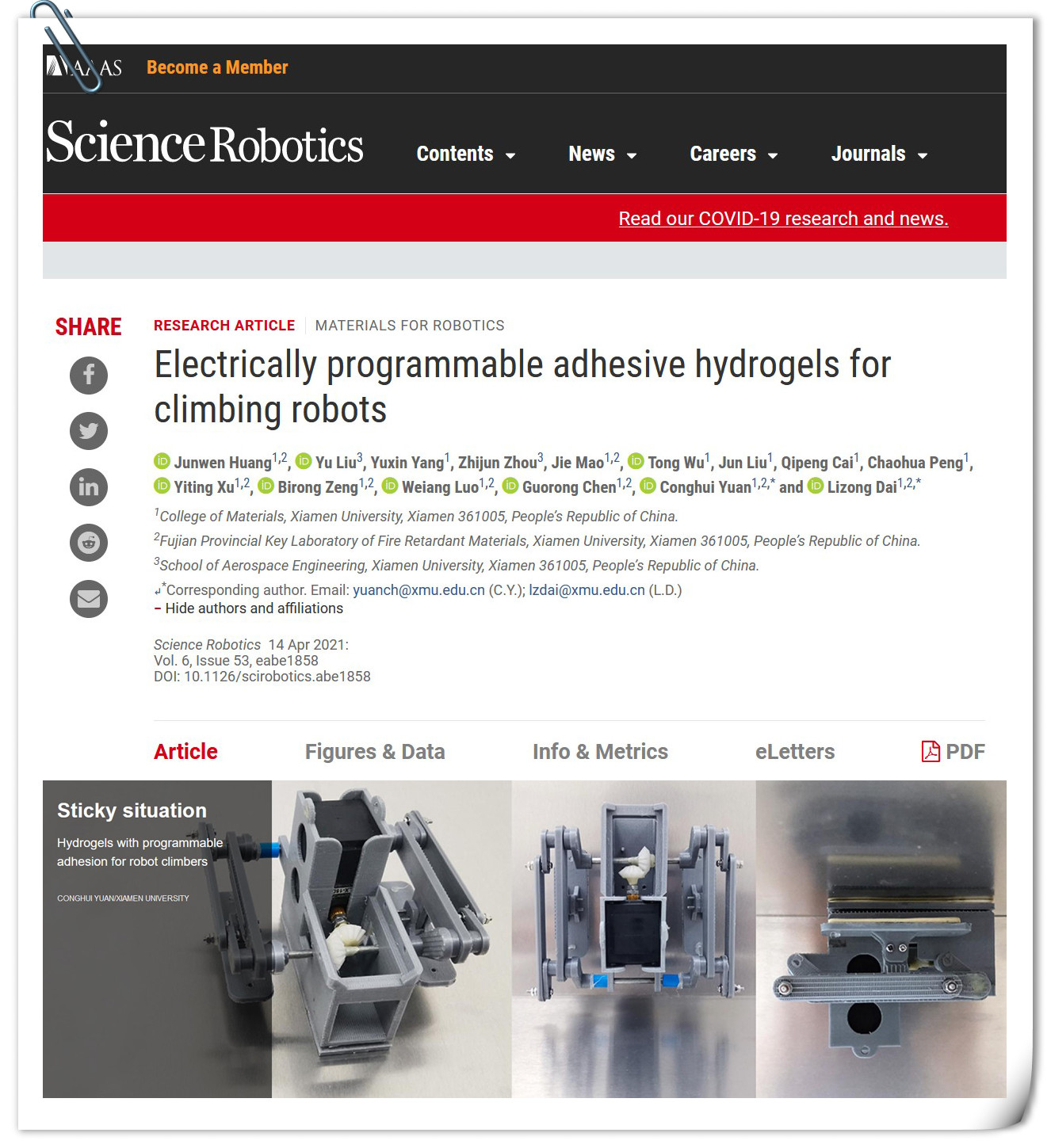 “我们希望在基础研究过程中设计出好材料,并快速找到产业应用的出口”,为了让科研成果走出实验室,戴李宗和团队成员立足高分子材料的前沿基础和应用挑战性难题,不断提升科研敏锐性和创新力,持之以恒、长期不懈攻坚克难。在“材料引导跨学科融合”方面走出了特色路子,近期提出具备电控粘/脱粘性能的“新概念胶水”,通过高分子、电化学、机械制造、电子信息等多学科的交叉,建立了机器人攀爬新模式,相关结果发表在Science子刊Science Robotics。