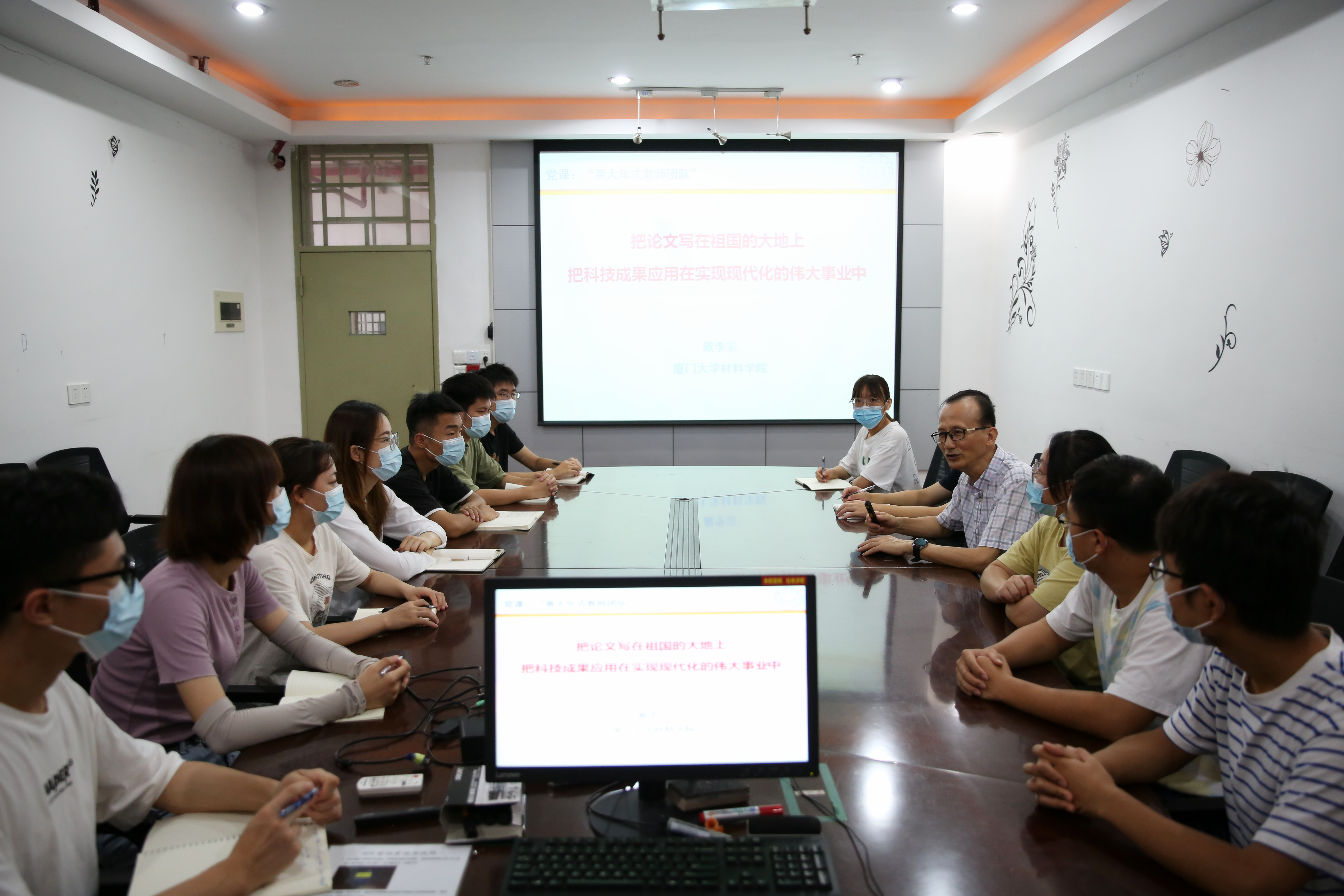 10月8日早上,受疫情影响刚刚恢复科研工作的“高分子材料设计与创新应用”团队师生,即在科学楼404会议室里召开课题组组会。与往常一样,在组会之前,他们先上了一堂党课,主题是:把论文写在祖国的大地上。戴李宗说这是他每次读到都会深受感动的一句话,也是他几十年教学科研中秉承的一份坚持。