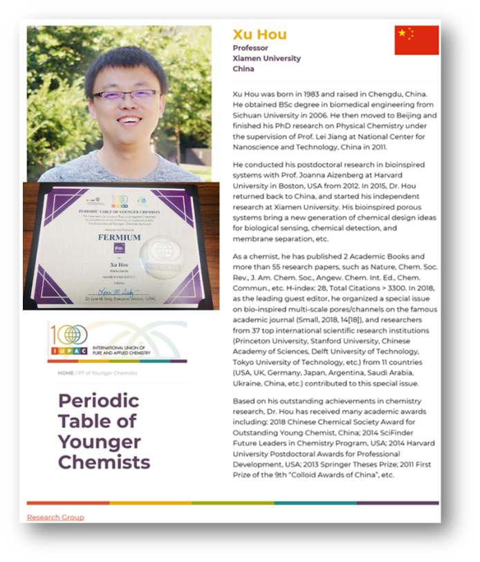 2019年是由联合国确立的“国际化学元素周期表年”,也是世界权威的化学组织国际纯粹与应用化学联合会(IUPAC)成立100周年。IUPAC与国际青年化学家网络(IYCN)在世界范围内发起了征集,征选118位杰出的青年化学家,参照国际化学元素周期表,制作了一张“青年化学家元素周期表”。入选的青年科学家们不仅为造福全人类而“战斗”在科研前线,还代表着国际化学学科在下一个百年的发展方向。在这张周期表中,出现了九位中国青年化学家的名字。侯旭便是其中之一,代言第100号元素“镄”。