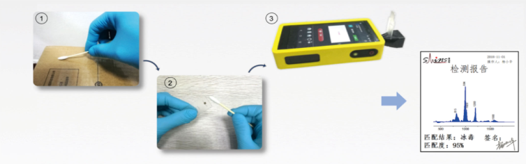 只需通过一根简单的棉签,在疑似吸毒者接触过的桌面、茶杯擦拭,再将样品转移到我们的毒品拉曼快检仪上,简单几个步骤,便可在十秒钟快速识别有无毒品残留。