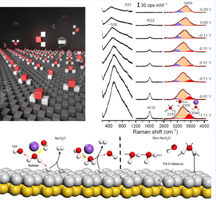 李剑锋课题组利用原位表面增强拉曼光谱技术,在电催化析氢反应过程中,对钯单晶电极/溶液界面水分子的构型及其动态变化过程进行实时监测。