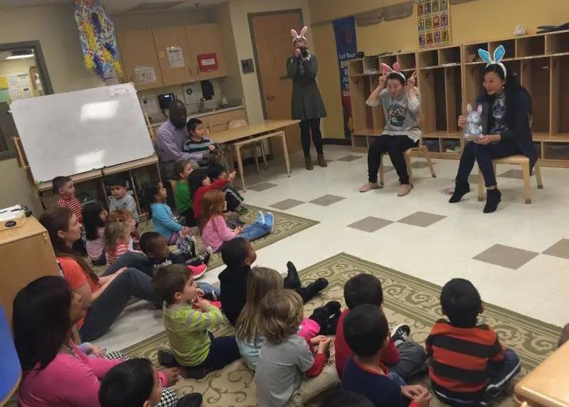 ▲肖晓燕在美国教托儿所小朋友中国手语数字