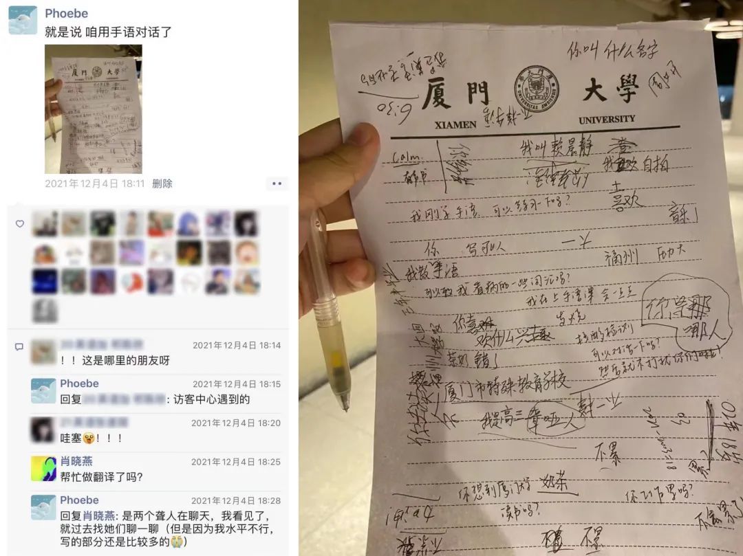 原来这是一位上过几次手语课的同学发布的朋友圈。她在厦大校园里偶遇了几位聋人,发现他们交流不便,便主动上前打招呼、帮忙做翻译。尽管掌握的手语不多,但仍然热情地将自己所学都展示出来,不会表述时就用纸笔来交流。一份纯粹的真心和善意,打破了聋人和听人之间的壁垒。