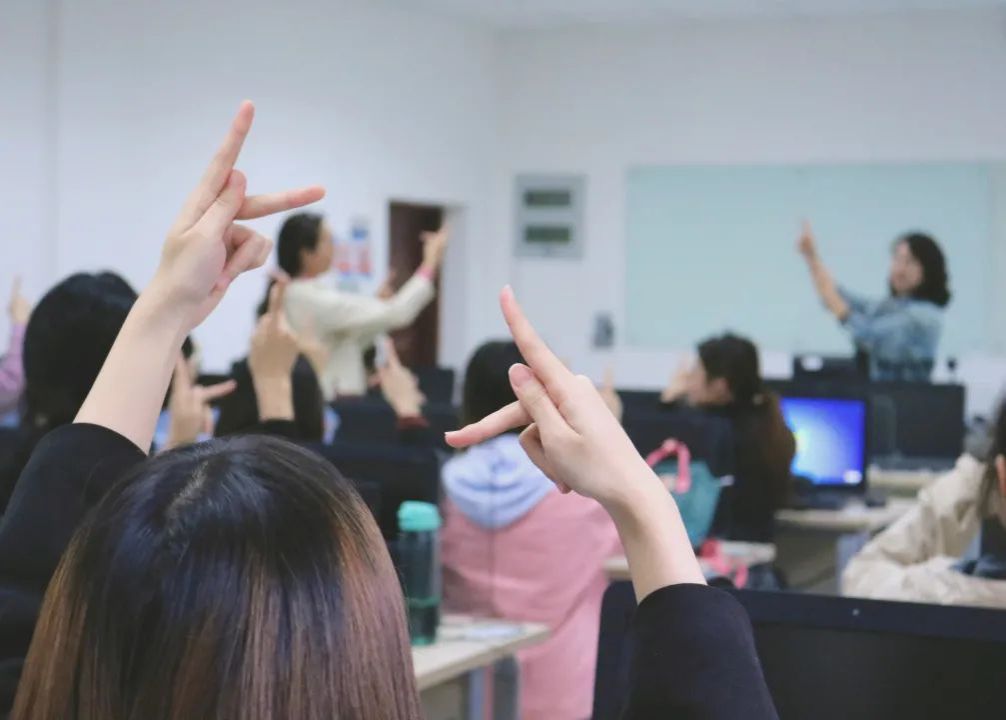 这样的语言课显然是有些特别,师生之间的交流不依靠于声音,但课堂氛围仍然积极而欢乐,同学们略微笨拙却无比认真地模仿和记忆着不同的姿态和手势。