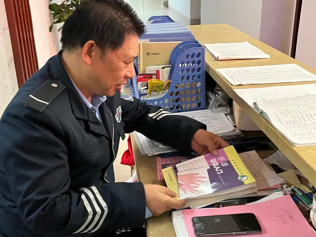 最近,外文学院保安严先伟的桌上摆着肖晓燕赠予的《手语轻松入门》,进出外文学院的师生时常可以看见他认真地学习打手语。