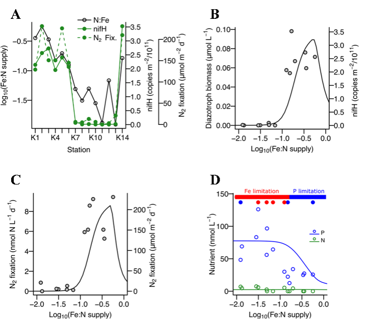 该项研究系统阐明了西北太平洋从边缘海到开阔大洋的固氮速率和固氮生物的空间格局,发现固氮速率和固氮生物丰度与硝酸盐跃层深度以及Fe:N比值显著相关,并首次揭示了西北太平洋固氮作用的铁、磷营养盐限制及其空间变异性,填补了该研究领域的空白。