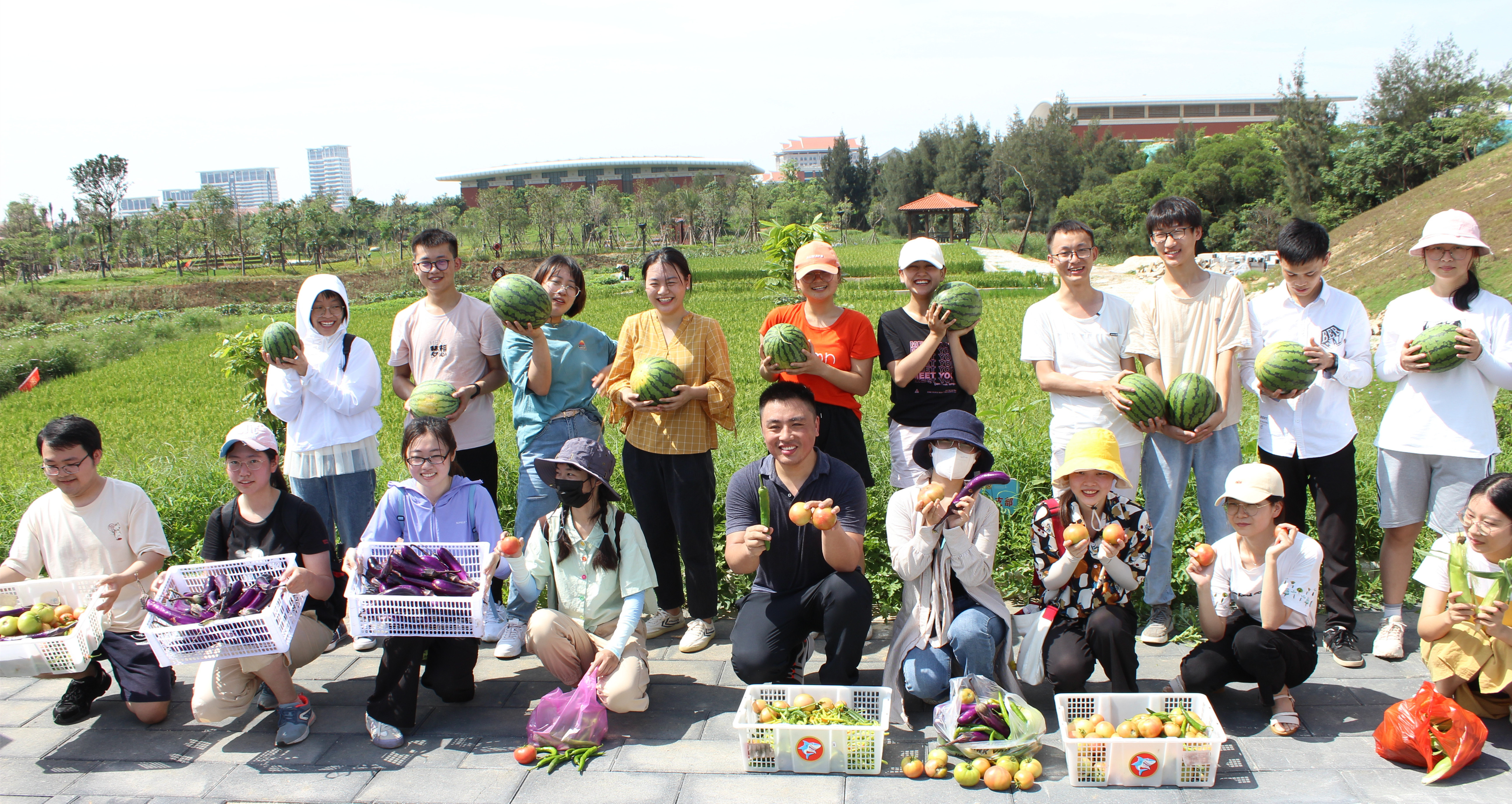 “八闽园”新农科实践基地里,生命科学学院师生们正热火朝天地采摘蔬果。他们半扎马步,手拿剪刀,架势十足!