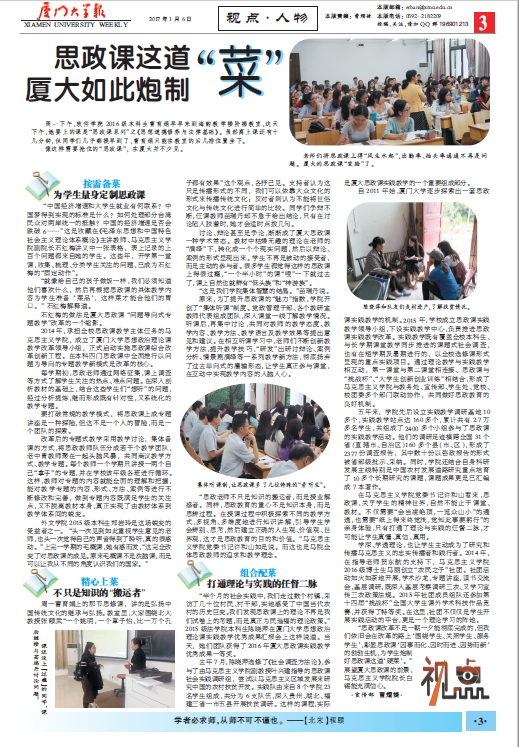 我校的获奖情况是:曹熠婕的《思政课这道“菜” 厦大如此炮制》获通讯类一等奖,本报编辑部的《保持定力 提高标准》获言论类二等奖,月明编辑的校报第1190期第八版获版面类三等奖。