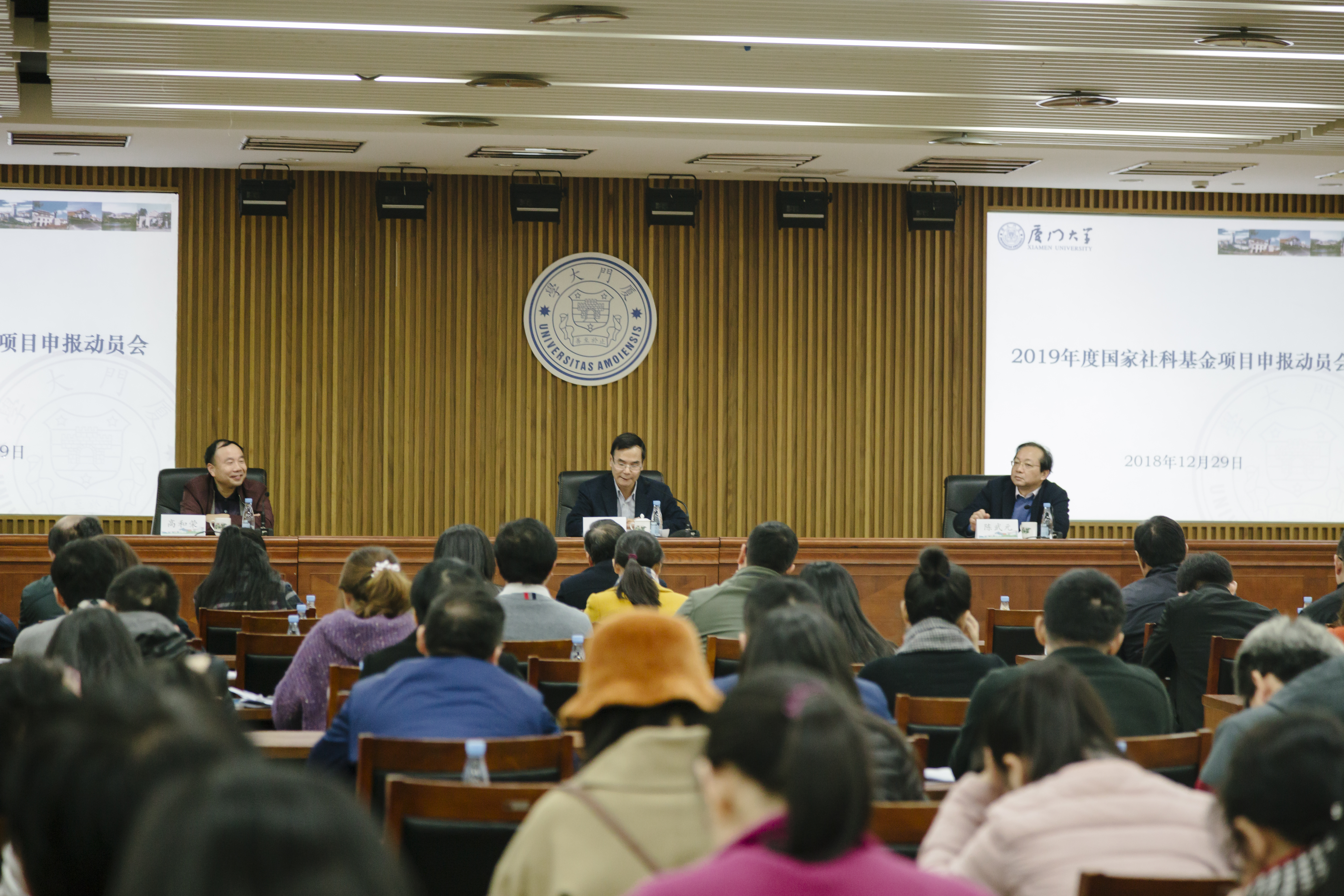 12月29日下午,2019年度国家社科基金项目申报动员会在科学艺术中心一楼多功能厅召开。副校长杨斌,社科处、文科各学院/研究院分管科研副院长、科研秘书,部分离退休教师及博士后等共100多人参加了动员会。会议由社科处原处长、厦门大学学报(哲学社会科学版)编辑部主任陈武元教授主持。