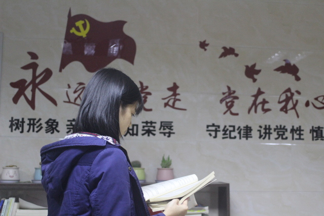 “永远跟党走,党在我心中”、“守纪律、讲党性、慎言行”等标语贴在了墙上,最新的党报党刊排放在了书柜中供同学们随时取阅,墙角还贴心的准备了应急药箱。