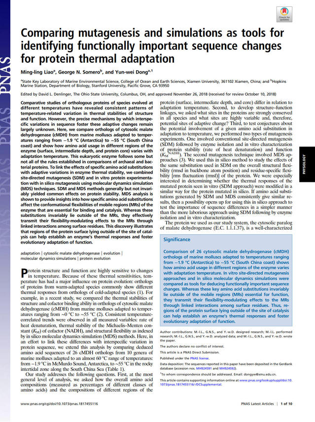12月24日,我校近海海洋环境科学国家重点实验室、海洋与地球学院董云伟教授与斯坦福大学 George Somero 教授合作,在 Proceedings of the National Academy of Sciences of the United States of America (PNAS)(《美国科学院院报》)发表题为“Comparing mutagenesis and simulations as tools for identifying functionally important sequence changes for protein thermal adaptation”的研究论文,探讨了海洋软体动物蛋白质温度适应性变化模式。这一文章与该团队2018年初在PNAS发表的“Structural flexibility and protein adaptation to temperature: Molecular dynamics analysis of malate dehydrogenases of marine mollusc”一文共同开辟了利用计算生物学进行贝类进化研究的方向。