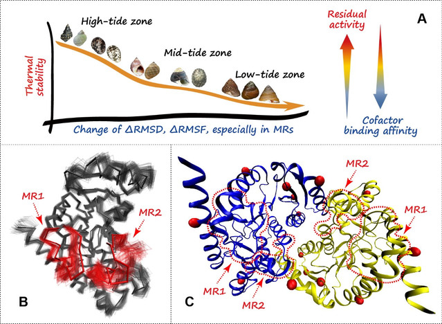 董云伟团队在潮间带生物生化适应机制的研究过程中,结合分子动力学模拟和实验调控手段,发现极端高温下,耐热滨螺能够通过增强代谢关键酶的作用,避免蛋白质的解链,保持微结构完整和功能维持(J Exp Biol, 2017);通过对原位体温跨度达60℃的12种软体动物的研究,定量了cMDH结构柔性的温度适应性变化程度,揭示了氨基酸温度适应性进化的关键位点,阐述了蛋白质结构稳定性与生物地理分布的内在联系。将海洋软体动物生化适应研究从单一的定性实验,拓展到了基于计算生物学的定量研究,揭示了海洋软体动物细胞质苹果酸脱氢酶(cMDH)结构稳定性和功能适应性的趋同进化模式,建立了基于代谢关键酶的“酶促动力学—蛋白合成—模拟计算”的生化适应机制的创新性研究模式。