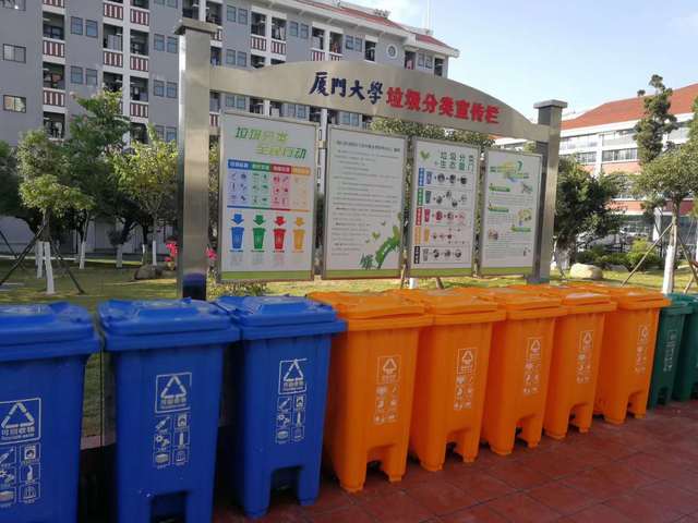目前,我校在校内住宅区、学生宿舍区和公共区域设置了90余个垃圾投放点,并配备700余个分类垃圾桶。为更好提高垃圾分类中转运输能力,我校还在后山花圃设立统一的垃圾集中转运点。翔安校区目前在学生公寓园区设立生活垃圾分类投放点20个,其他公共区域11个,学院垃圾集中点9个,投入可回收、其他、厨余、有害四类垃圾桶545个,不锈钢垃圾分类桶60套。