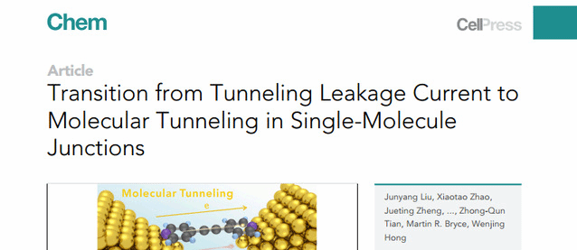 化学化工学院洪文晶教授课题组在有机分子电子器件的尺寸极限研究取得重要进展。相关研究成果以“Transition from tunneling leakage current to molecular tunneling in single-molecule junctions”为题发表于CellPress旗下的Chem(DOI:10.1016/j.chempr.2018.11.002)。