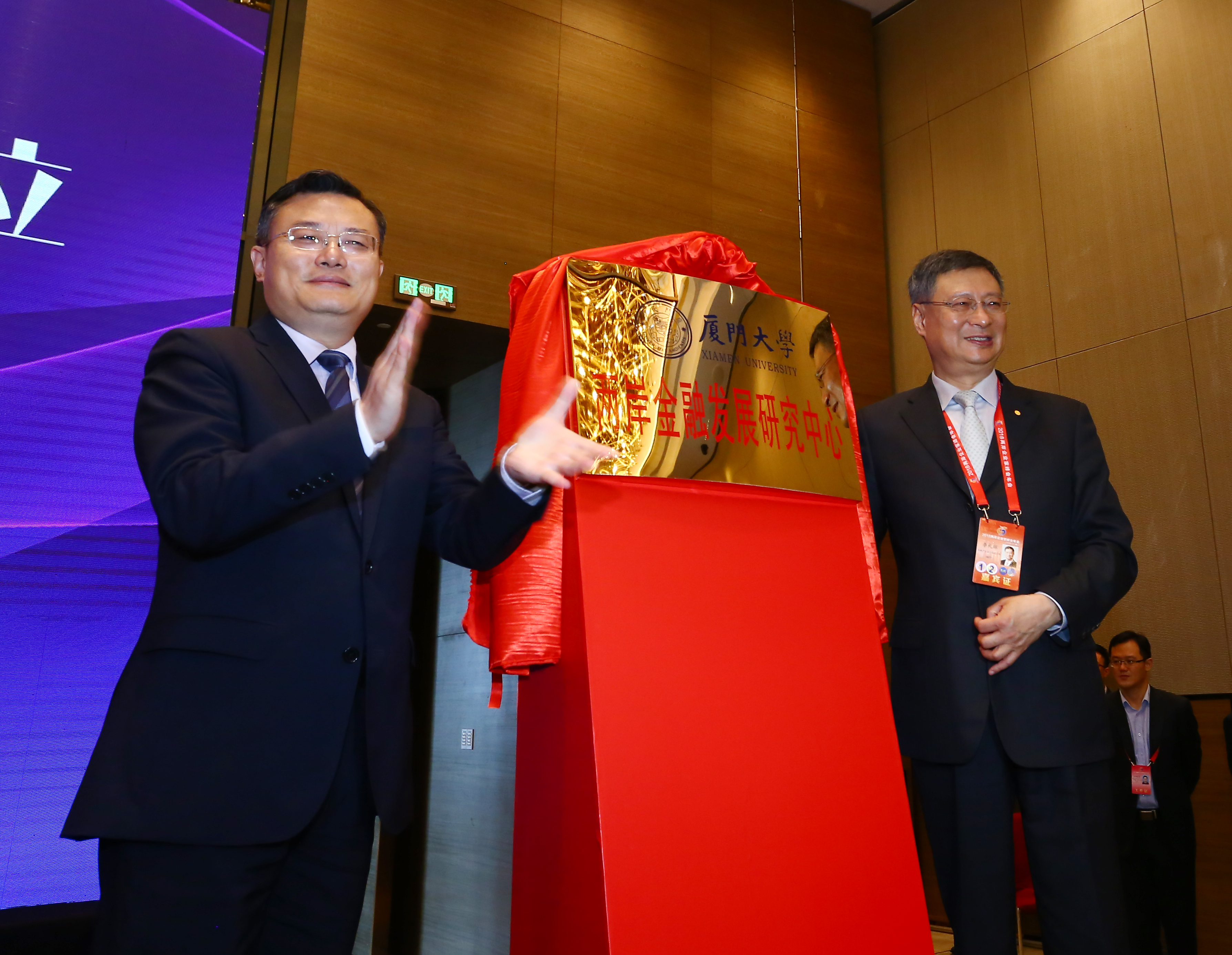 金融产业合作推进小组陆方召集人李礼辉与厦门大学校长张荣、厦门国贸集团股份有限公司总裁高少镛、厦门银行董事长吴世群、厦门国际银行副总裁黄大庆共同签署合作框架协议签署。两岸企业家峰会理事长萧万长、副理事长张平、秘书长陈瑞隆,台方召集人魏启林,福建省人民政府副省长郭宁宁,金融产业合作推进小组台方副召集人李纪珠,国台办经济局局长张世宏,省金融监管局局长薛鹤峰,厦门市副市长韩景义,省政府副秘书长詹志洁见证签约仪式。李礼辉、张荣共同为中心揭牌。