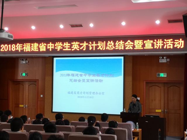 会上,省青少年科技活动中心主任侯小慰代表省英才计划管理办公室总结了2018年福建省中学生英才计划的实施情况,肯定大学、中学联合开展科技创新人才培养的成效,并对后续培养工作提出相关要求。侯主任对2019年的英才计划学员遴选工作进行了宣讲和部署,希望学生、家长、老师要树立理性的培养观念,建立良好的配合机制,各中学加大宣传力度、把好学员入口关。