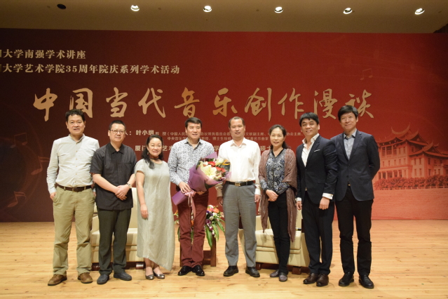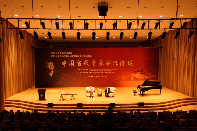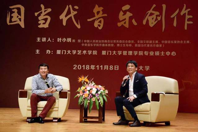 11月8日下午,作为厦门大学艺术学院35周年院庆系列学术活动之一,艺术学院特邀全国政协常委、全国文联副主席、中国音乐家协会主席、中央音乐学院作曲系教授、博士生导师叶小纲教授,在我校科学艺术中心举办南强学术讲座《中国当代音乐创作漫谈》。厦门大学党委副书记林东伟、福建省音乐家协会副主席兼秘书长唐晓燕、厦门爱乐乐团团长方翊、集美大学音乐学院院长臧艺兵、吉林艺术学院音乐学院副院长元杰、厦门大学艺术学院副院长赵艳方等领导嘉宾参加了活动。此次讲座由厦门大学艺术学院和厦门大学管理学院专业硕士中心联合主办。