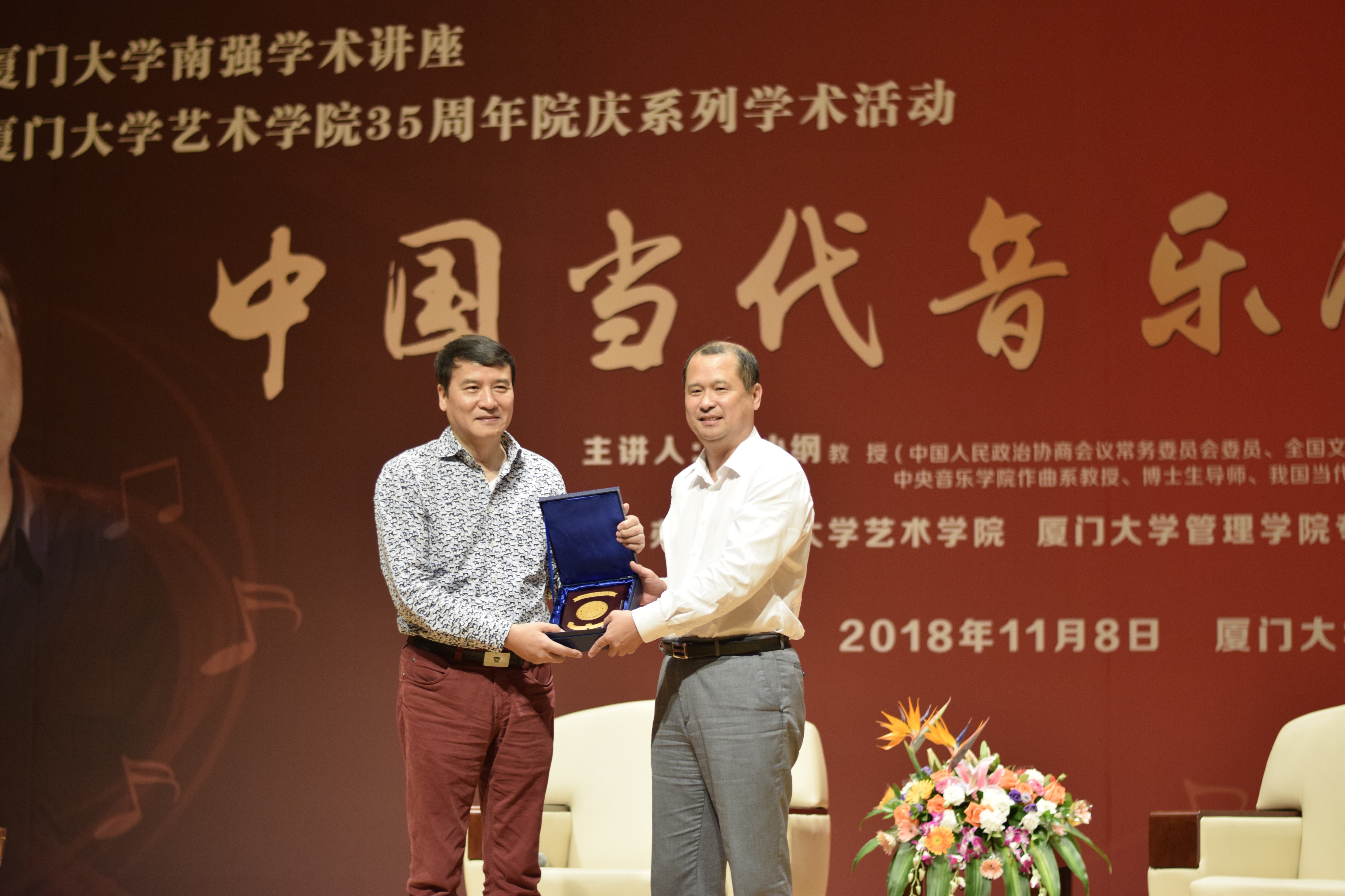 厦门大学艺术学院副院长陈舒华主持了本场讲座。讲座开始前,林东伟授予叶小纲教授南强学术讲座纪念牌,对叶小纲教授的到来表示由衷的欢迎。