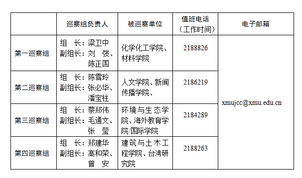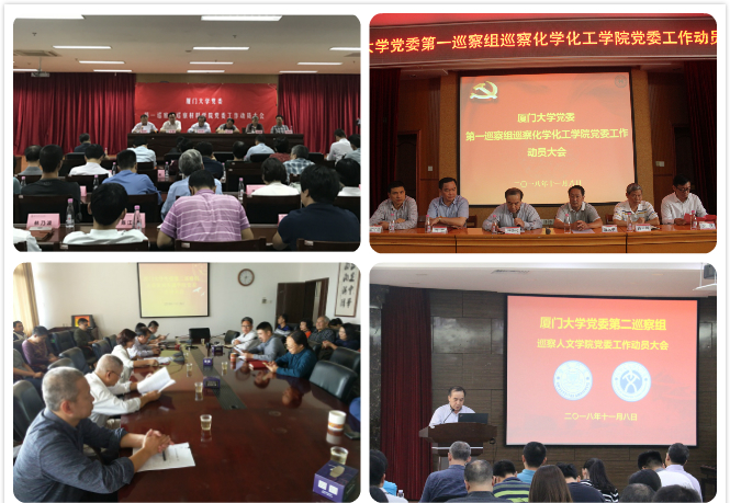 根据《中国共产党章程》《中国共产党巡视工作条例》和中央关于探索开展市县巡察工作的精神,以及我校巡察工作管理办法,经校党委研究决定,中共厦门大学第十一届委员会启动第一轮巡察工作,校党委组建4个党委巡察组,对化学化工学院、材料学院、人文学院、新闻传播学院、环境与生态学院、海外教育学院/国际学院、建筑与土木工程学院、台湾研究院8个基层党组织开展巡察工作,巡察时间1个月左右。日前,四个巡察组已经全部进驻巡察。