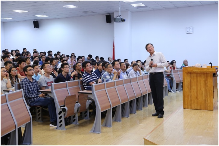 袁亚湘院士从数据的收集、应用驱动出发,引出大数据的规律、分类和预测等问题,提出了数据问题的优化建模和复杂性,用通俗易懂的语言介绍了正则化问题、稀疏问题、压缩感知、矩阵完整化、距离几何问题、分类问题、梯度法、随机梯度法、交替方向法等当前国际上备受关注的数据优化问题和主要优化算法,深入浅出地解释了这些方法的本质和关键,为在场的师生们揭开了数据科学与优化研究的神秘面纱。袁亚湘院士用“老瓶装新酒”、“分而治之”和“基础数学理论威力强大”总结了数据科优化带来的启示,一是简单经典的数学方法在现代数据科学中发挥出新的作用,二是数据科学问题是具有特殊结构的,要依据数据的结构对数据问题进行分解,三是大量数据中常常隐含着“凸性”和“流行上的优化”等性质,这体现出基础数学理论具有强大的威力。