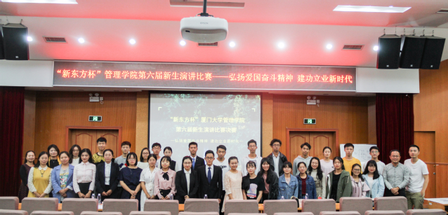 2018年10月28日晚,厦门大学管理学院“新东方杯”第六届新生演讲比赛决赛在化学报告厅顺利举行。管理学院本科新生300余人共同观摩、学习了比赛。大赛由厦门大学管理学院主办,管理学院学生会承办。