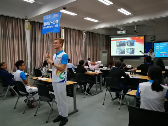 次日早晨,志愿者们六点多就要起床,做好准备工作。一直到下午一点多结束,没有午餐时间。赛场组的志愿者,每个教室大约有五人,有人负责指引,有人负责递送麦克风。而博雅力是那个负责举牌的人——每个参赛团队有十分钟展示时间,九分钟过后,博雅力举起一个蓝色牌子,“倒计时一分钟”。