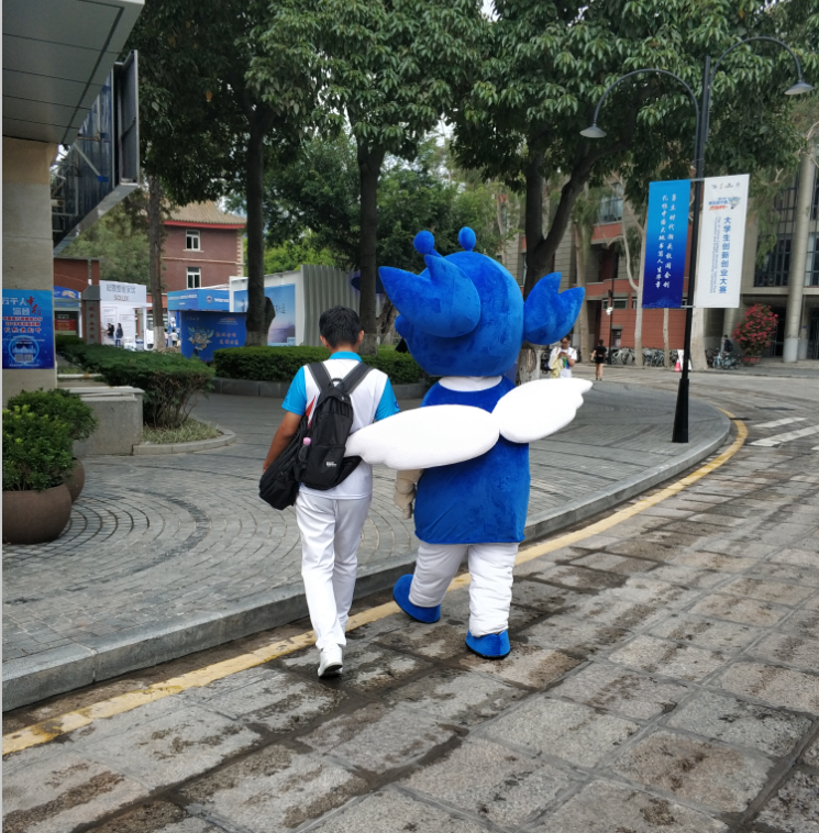 据人偶志愿者负责人聂岑娜介绍,目前一共有27名志愿者在负责涌仔的人偶服装,每天分成十组,每组有2-3人轮流穿上涌仔服装。工作时间从早上7点到晚上6点,长达11个小时。这十组人偶分别分布在三家村广场、科学艺术中心走廊和芙蓉湖边等人流量比较密集的地方与参赛队伍和其他同学进行互动、宣传,同时,他们还是颁奖典礼上的特殊“嘉宾”,所以每天晚上还要集体参与颁奖典礼的彩排。