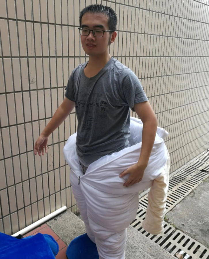 正逢交接班的时候,刚换下衣服的李诗睿正满头大汗地站在一旁,自己浑身衣服都汗湿了,还在引导刚穿上衣服的同伴。因为要带上头套的原因,志愿者视野非常受限,只能看见脚下小小的一块地方,仅能依据行人的脚步和声音来判断,长距离走路时就需要其他人的引导和搀扶。因此,每位人偶涌仔都会有一位志愿者专属陪伴。