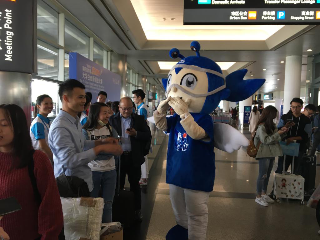 在学校南大门,志愿者刘荣旭正在帮参赛队伍和涌仔人偶拍照。在刘荣旭看来,涌仔作为吉祥物不仅在校园里非常受大家欢迎和喜爱,去机场接机时,也有许多参赛队伍为涌仔的出现而惊喜欢呼,同行的志愿者也非常体谅他们的辛苦和困难,在许多事情上都给予帮助。自己在参与这个活动中,给他人带来欢乐,也和老师同学们培养了深厚的感情。