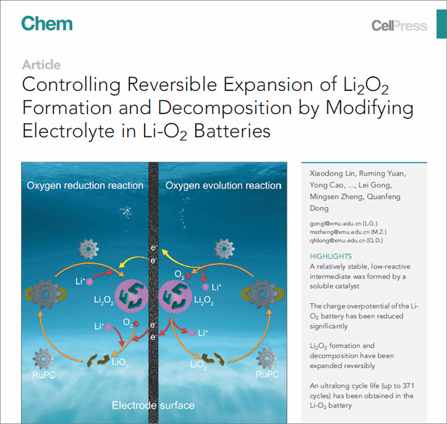 化学化工学院董全峰教授课题组和龚磊副教授课题组在锂空气电池溶液相催化方面取得重要进展,相关研究成果以“Controlling Reversible Expansion of Li2O2Formation and Decomposition by ModifyingElectrolyte in Li-O2 Batteries”为题发表于Cell Press旗下的Chem期刊(DOI:10.1016/j.chempr.2018.08.029)。