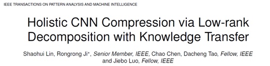 近日,国际顶级学术刊物《IEEE Transactions on Pattern Analysis and Machine Intelligence》(PAMI)接收了厦门大学信息科学与技术学院纪荣嵘团队的最新研究成果“Holistic CNN Compression via Low-rank Decomposition with Knowledge Transfer”。PAMI是计算机科学领域最顶级的国际期刊,其影响因子为 9.45。