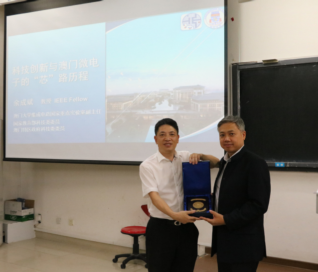 余成斌教授从高校与科技创新、企业与科技创新、澳门与科技创新,澳门“芯”的诞生和发展等几个方面向在场师生阐述了芯片的科技创新带来的机遇与挑战。同时,余教授以澳门大学为例,讲述了澳门大学近二十五年来芯片领域从无到有再达到世界一流的发展经历,从学术到产业的不断革新,芯片产业的创建和产业设计的应用,描绘了一幅芯片产业蓬勃发展的宏伟蓝图。余教授在言谈中表达了对芯片行业的人才缺乏和流失的担忧,也期待更多的芯片人才能够发挥自己的才智,积极为国家芯片行业的发展添砖加瓦,争取早日跻身世界一流。
