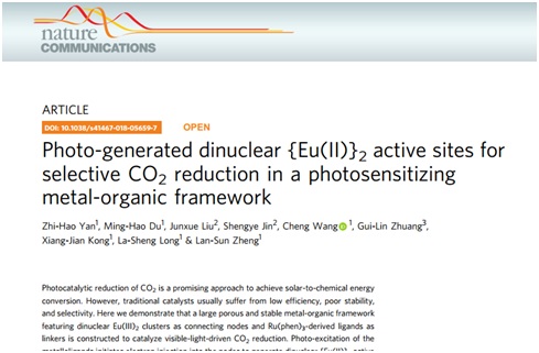 化学化工学院孔祥建教授与龙腊生教授课题组在稀土簇基金属有机框架材料光催化还原CO2的研究中取得重要进展,相关结果“Photo-generated dinuclear {Eu(II)}2 active sites for selective CO2 reduction in a photosensitizing metal-organic framework”发表在《自然-通讯》 (Nature Communications, 2018, 9, 3353)。