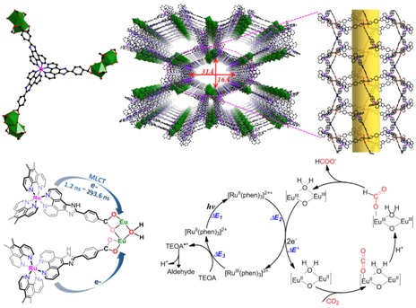 利用太阳光驱动CO2还原不仅可降低大气中CO2浓度,而且可以生成重要的化工原料,是缓解气候变暖和开发新能源的理想途径之一。然而如何制备高效光催化剂将CO2高选择性地转化为高附加值的化学产品极具挑战性。课题组巧妙地将具有催化活性的稀土簇合物与光敏配体组装在一起,合成了具有大孔结构的稀土Eu-Ru(phen)3-MOF催化剂,实现了可见光驱动的CO2到甲酸盐的高效选择性转化。研究表明,该材料光催化生成甲酸盐的反应速率可达到321.9 μmol h−1 mmolMOF−1,这是至今为止报道的光催化还原CO2转化为甲酸盐活性最高的MOFs催化剂。原位电子顺磁共振(EPR)结果显示,光照条件下原位生成的双核 Eu2+单元是光催化活性位点。另外,通过超快瞬态光谱和稳态/瞬态荧光光谱数据,并结合密度泛函理论计算(DFT),揭示了光催化反应体系的光生电荷分离与传输机制,解释了光催化反应机理。该工作为设计具有高催化活性的稀土MOFs材料提供了实验参考。