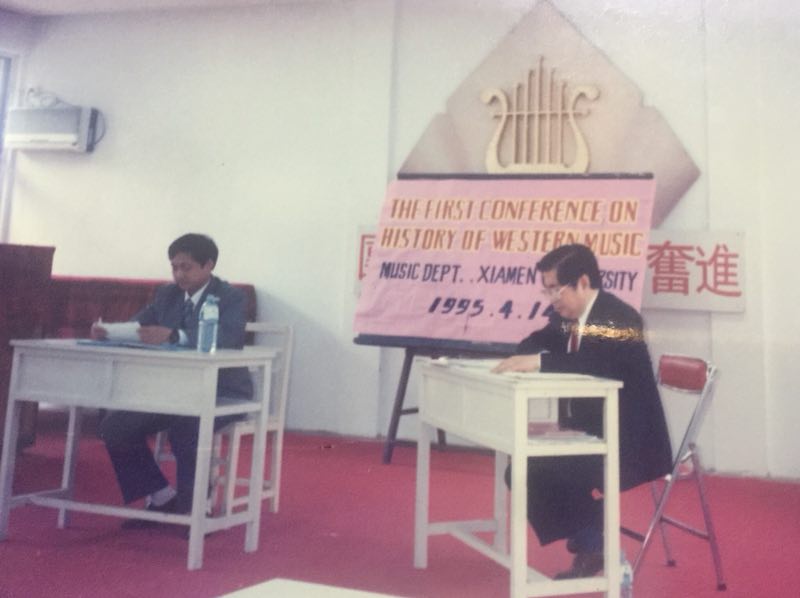 1995年4月14日,周畅教授(右)主持厦门大学艺术学院首届研究生专业英文暨西方音乐史学术研讨会。