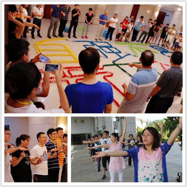 除此之外,在教学研讨之余,夏令营还组织了素质拓展活动来促进两校教师的互动交流。学员们在美好的清晨,跟随艺术学院的杨帆老师进行形体训练,学着如何站得优雅,如何走得自信,完善自己的仪态;在凉风习习的夏夜,跟随体育教学部的林秋华老师放松心情,完成团体多米诺骨牌游戏,并自发进行了一场两校篮球友谊赛。