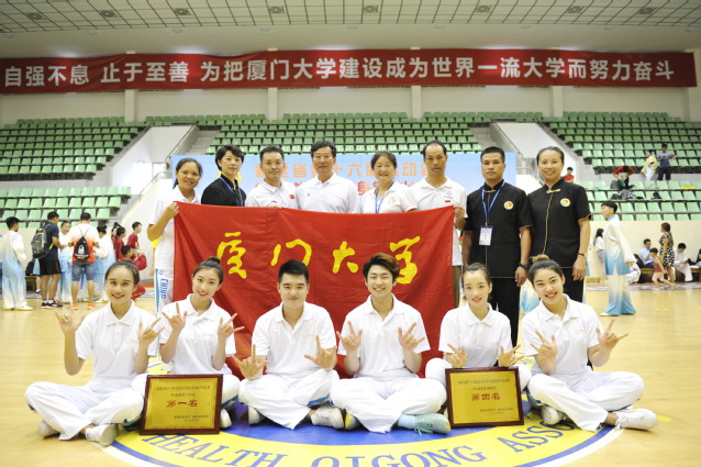 其中,厦门大学健身气功队有6人参加甲A组比赛。经过2天的激烈角逐,共斩获3块金牌,包括甲A组集体六字诀第一名,女子甲A组六字诀个人赛第一名和男子甲A组六字诀个人赛第一名(分别由徐杨逸箫和白宗平两位同学摘得),发挥出色,赛出了佳绩,赛出了风采。