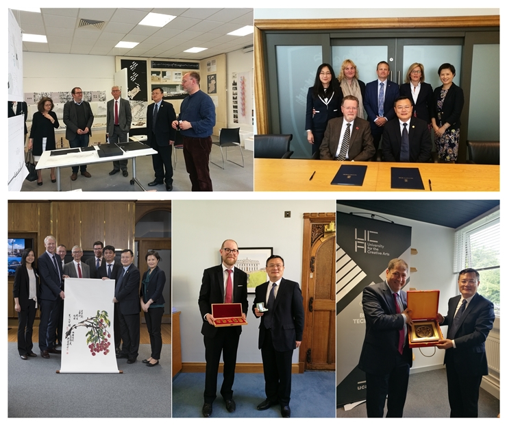 在创意艺术大学,张荣一行的来访受到了创意艺术大学校长Bashir Makhoul和同事的热烈欢迎,两校校长共同在两校合作备忘录上签字。张荣还与Makhoul校长、常务副校长Alan Cooke、学术副校长 Roni Brown以及助理校长等就两校在创意教育和文化创意等领域开展合作进行了深入探讨。创意艺术大学(UCA)由具有100多年历史的英国肯特艺术与设计学院和萨里艺术与设计学院于2005年合并成立,现为英国唯一一所提供创意艺术教育的大学,也是欧洲第二大提供创意艺术教育的高等学府。