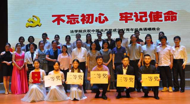 2018年6月30日晚,由中共厦门大学法学院委员会主办,厦门大学党规党纪学生研习社、厦门大学法学院学生会、厦门大学法学院研究生会承办的“不忘初心、牢记使命”法学院庆祝中国共产党成立97周年经典诵唱晚会在厦门大学法学院模拟法庭成功举办。校关工委主任陈力文、以及组织部、宣传部、学生处、法学院等相关负责人出席了晚会。