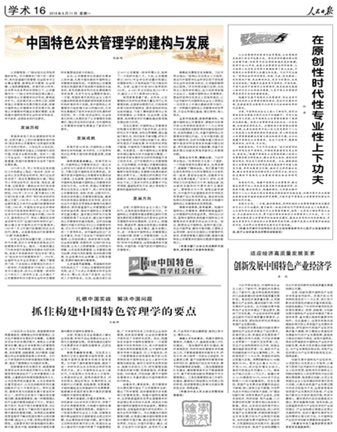 “公共治理”学科(群)是我校正在建设的一流学科(群)之一。6月11日出版的《人民日报》第16版(学术版)“构建中国特色哲学社会科学”栏目刊登了我校“公共治理”一流学科建设项目首席专家、“长江学者”特聘教授、公共政策研究院院长陈振明教授题为“中国特色公共管理学的建构与发展”的观察与思考文章。