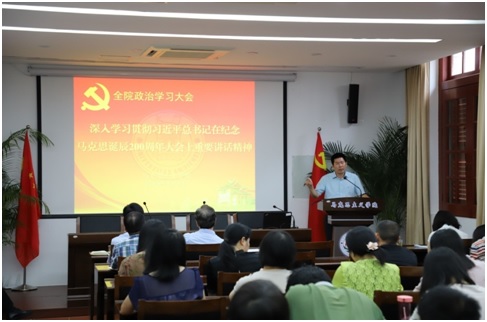 2018年6月6日下午,马克思主义学院在囊萤楼216报告厅举行了全院政治学习大会,大会以“深入学习贯彻习近平总书记在纪念马克思诞辰200周年大会上重要讲话精神”为学习主题。会议由党委书记许和山主持,全院教职工以及学生支部委员参加了本次大会。