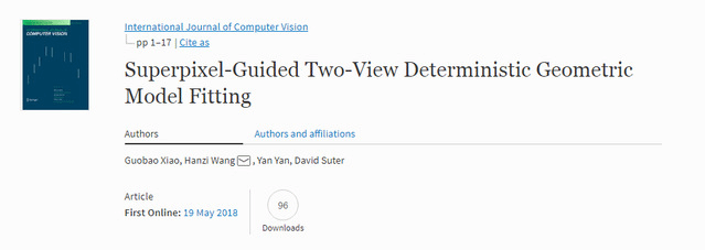 近日,国际学术期刊《International Journal of Computer Vision》在线发表了我校信息科学与技术学院王菡子教授课题组取得的最新研究成果“Superpixel-guided Two-view Deterministic Geometric Model Fitting”。IJCV是计算机科学领域最顶级的国际期刊之一,其影响因子为 8.222。该成果首次将超像素分割与模型拟合相融合以确定性地采样高质量的数据子集,用于解决复杂的几何模型拟合问题。