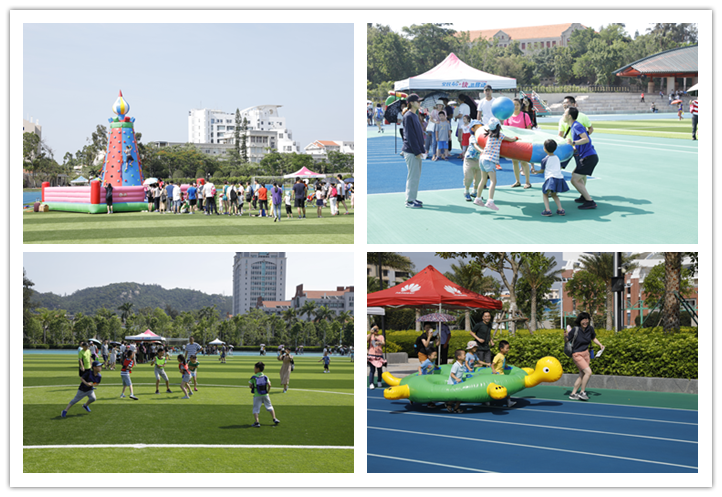 6月2日当天,粉色的攀岩塔、五彩的动感五环、龟兔赛跑、羊角球跳跳等12个项目在演武场一一亮相,气球小丑穿梭其中,给孩子们编出了气球魔法棒、小狗等玩具,平日体育竞技的演武场瞬间化作了欢乐的儿童嘉年华。每个到达现场的孩子都迫不及待地贴上胸贴,跃入场中,或找到伙伴三五成群地玩耍起来,或拉着爸爸妈妈的手奔向自己喜爱的项目。当天共有500多个家庭组参加到了活动中,每个项目都排着等待的队伍,但一点都不影响孩子们玩耍的兴致,许多教职员工也在排队时互相交流,都为学校举办的亲子运动会点赞!一位来自机关的教职工说:“孩子玩的很开心,这比放假在家看电视有意义多了,谢谢厦大让孩子有个欢乐的六一。”外文学院的老师则说:“平时忙于上课、科研,只有晚上和周末有空和孩子交流,谢谢学校为我们提供这么好的一个亲子互动的机会,感觉和孩子之间的感情加深了不少”;“厦大真棒!我们一定支持他在学校好好工作!”一位教职工家属激动地说道。