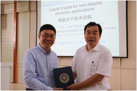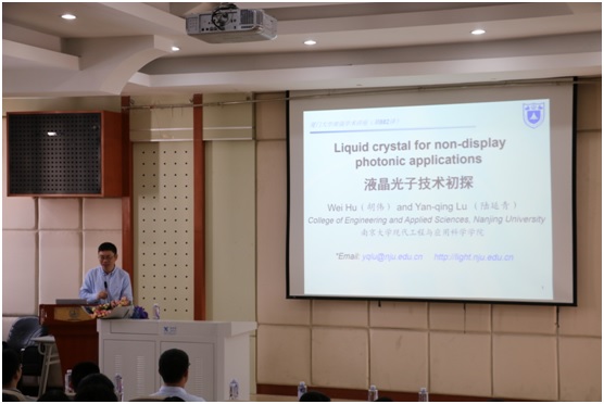 讲座中,陆延青教授通过通俗易懂的语言,深入浅出地为大家讲解了液晶材料独特的物理、化学与光学性质以及液晶光取向的基本概念,加深了在座同学对液晶光子学基础知识的了解,还对液晶发展史以及目前液晶在日常生活中的广泛应用做了简要的介绍,如平板显示、智能液晶玻璃、液晶黑板、可调谐光学透镜等。陆教授特别指出,拓展液晶在显示之外的先进光子技术应用具有广阔前景,值得国内学术界与工业界同仁齐心协力、协同发展。