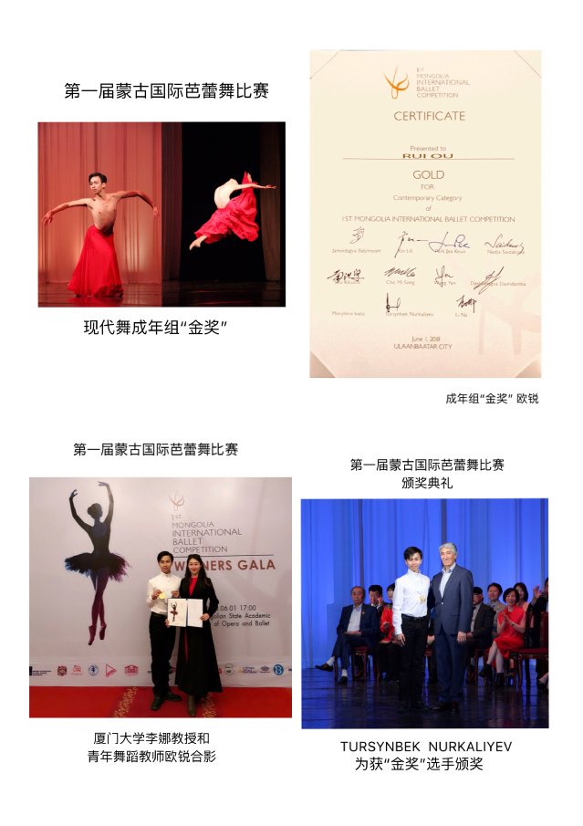 我校艺术学院李娜教授携青年舞蹈教师欧锐、舞蹈研究生陈祎超,代表中国厦门大学参加比赛。欧锐、陈祎超两位选手凭借原创作品《New Life》、《Rainy Night》挺进决赛,最终,欧锐以优异的成绩荣获现代芭蕾舞成年组金奖,李娜获唯一最高奖“最佳编舞奖”。比赛结束后,欧锐获得各国评委的一致好评,评委们热情邀请并推荐其参加各国文化交流活动。