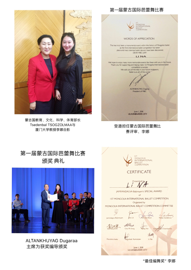 据悉,李娜还受蒙古国际芭蕾舞比赛组委会主席ALTANKHUYAG Dugaraa的邀请,担任第一届蒙古国际芭蕾舞比赛的嘉宾及评委,并于2018年5月30日受到蒙古国国家教育、文化、科学、体育部长TsedenbalTSOGZOLMAA接见,出席了比赛新闻发布会。
