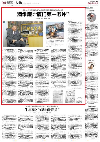5月10日,《中国教育报》第4版(新闻•人物版)以三分之二的版面深入报道了我校管理学院外籍教授潘维廉,题目是“潘维廉:‘厦门第一老外’”。